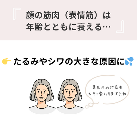 顔の筋肉(表情筋)は、年齢とともに使われにくくなり衰えていきます。